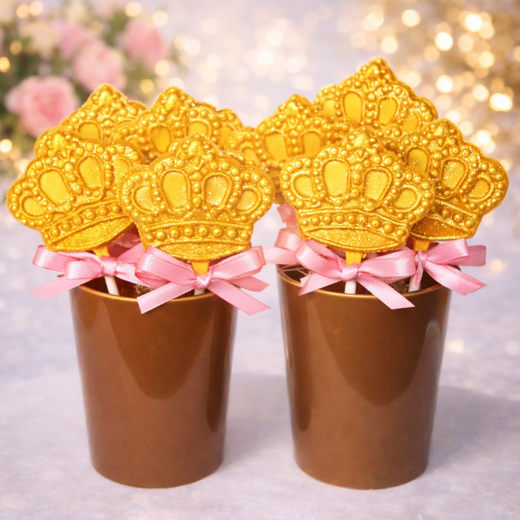 Pirulito de chocolate artesanal, acabamento dourado e laço decorativo. Ideal para compor mesas sofisticadas e lembrancinhas especiais.